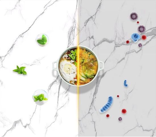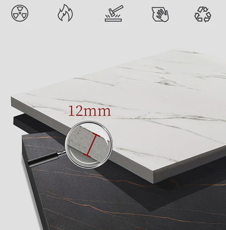 Mặt đá có độ dày ấn tượng, đảm bảo sự bền đẹp của chiếc bàn. Mặt đá có độ cứng vượt trội, chống cháy – chịu được nhiệt độ cao, chống bám bẩn – dễ vệ sinh, không chứa chất độc hại – không phai màu – không biến dạng.