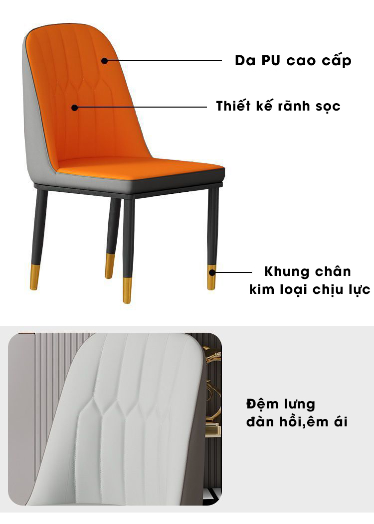 Đây là mẫu ghế ngồi theo phong cách Châu Âu sẽ mang đến vẻ đẹp thanh lịch cho không gian bày trí. Phần tựa lưng có các rãnh sọc được may tinh xảo và cẩn thận. Da PU cao cấp có khả năng chống thấm nước, chống trầy xước cực tốt. Đệm mút mật độ cao siêu đàn hồi, không lo bị xẹp lún và mất hình dáng ban đầu. Khung chân kim loại chịu lực, sơn tĩnh điện chống han gỉ, bền bỉ chắc chắn cùng thời gian.