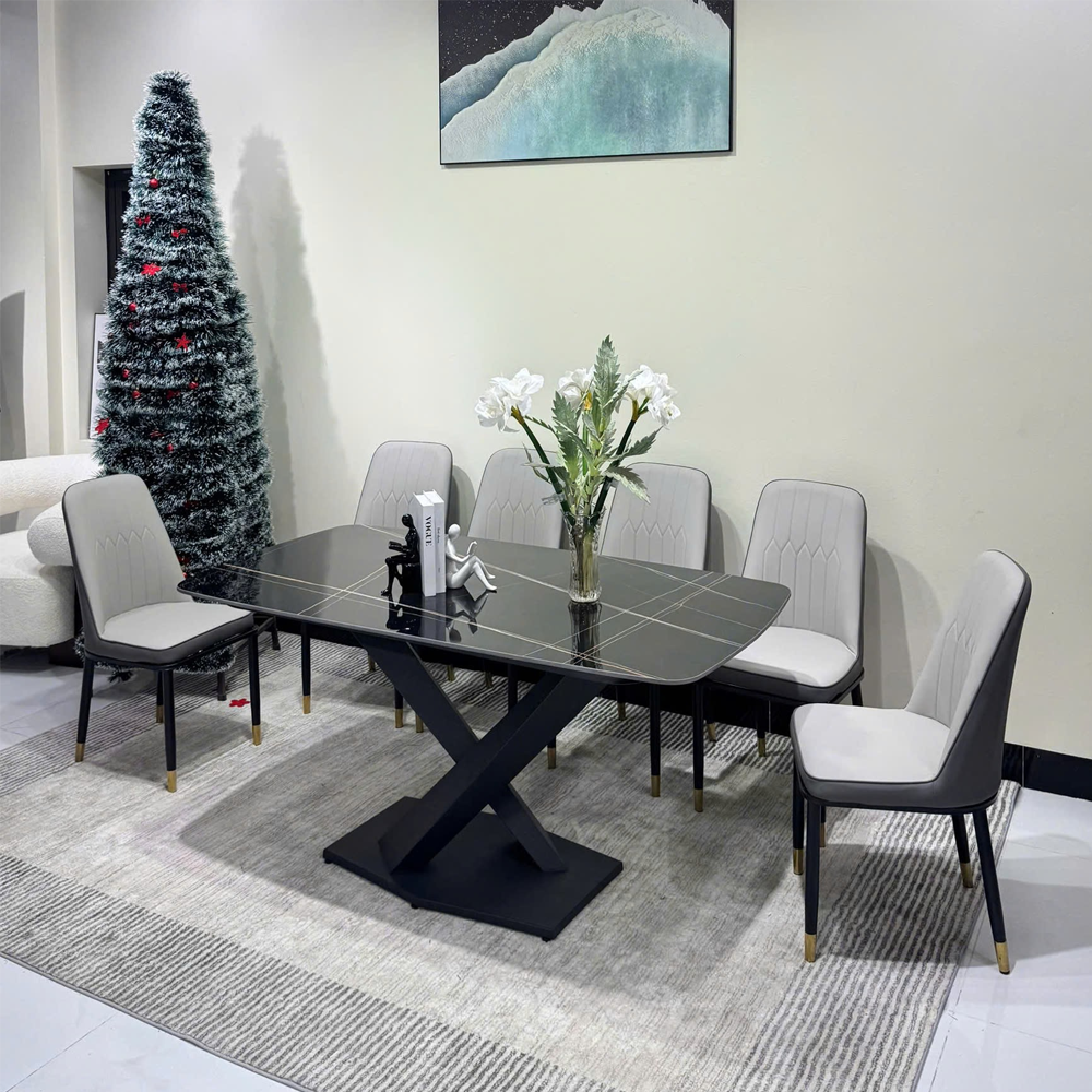 Bộ bàn ăn này sở hữu thiết kế đậm chất Châu Âu, chất liệu cao cấp cùng sự tiện nghi vượt trội, chắc chắn sẽ trở thành tâm điểm ấn tượng trong mọi không gian. Mặt bàn bằng đá Ceramic có độ cứng cao, bề mặt mịn màng, đường vân tự nhiên rõ nét, màu sắc bóng mượt quyến rũ. Khung chân trụ phá cách theo dáng chữ X bằng kim loại chịu lực kết hợp cùng tone màu đen huyền bí, khiến chiếc bàn trông thật cá tính. Các viền cạnh bàn được gia công nhẵn mịn, đánh bóng cẩn thận, nhằm loại bỏ sự sắc nhọn gây nguy hiểm cho người sử dụng.