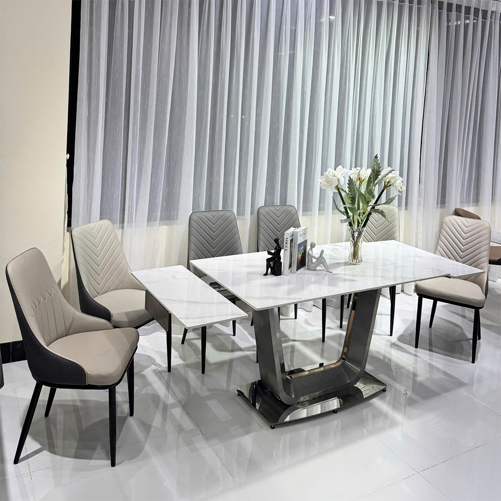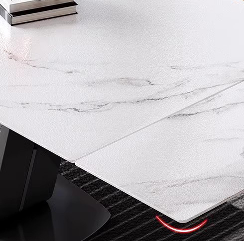 Mặt bàn được làm từ đá ceramic chất lượng cao, có độ cứng vượt trội cùng khả năng chịu nhiệt tốt, dễ dàng lau chùi khi bị bám bẩn. Ngoài ra, đặc tính chống thấm của đá ceramic cũng giúp bàn giữ được vẻ đẹp như mới sau thời gian dài sử dụng, đồng thời ngăn ngừa sự xâm nhập của vi khuẩn, đảm bảo an toàn vệ sinh.