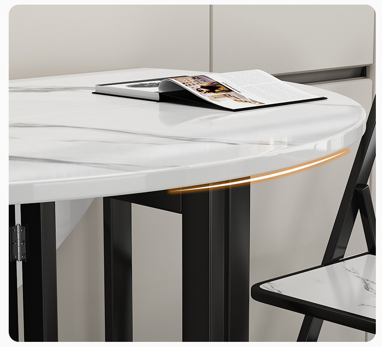 Bàn có thiết kế rất độc đáo, khi bàn gập lại, 1 khoảng không thông nhau bên dưới gầm bàn sẽ xuất hiện. Tận dụng triệt để khoảng không đó để lưu trữ ghế ngồi khi không sử dụng (có thể chứa được 4 chiếc ghế), giúp tiết kiệm không gian một cách tối đa.