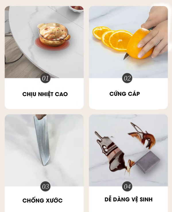 Bộ bàn được làm từ gỗ MDF cao cấp đạt tiêu chuẩn E1. Đây là dòng gỗ công nghiệp đời mới được sử dụng phổ biến trong ngành sản xuất nội thất thế giới. Với nhiều ưu điểm tuyệt vời: cứng cáp, chắc chắn, đã qua xử lý không bị cong vênh - mối mọt - bể mục. Bên ngoài phủ melamine có họa tiết giả đá cẩm thạch, giúp bề mặt đều màu, chống ẩm mốc - chống xước tốt, dễ vệ sinh khi bị bám bẩn, an toàn cho người sử dụng.