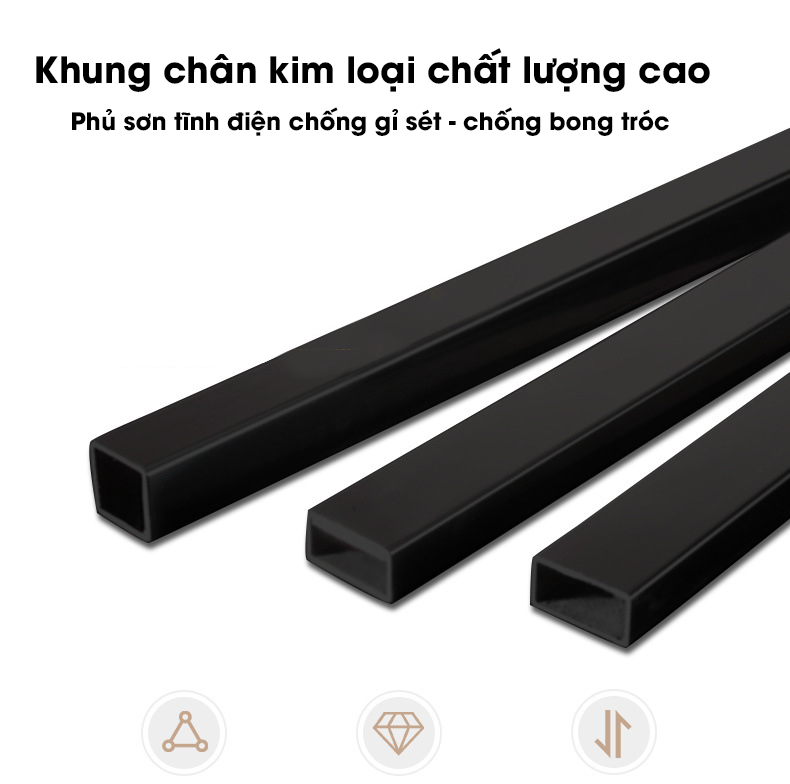 Khung chân kim loại chất lượng cao, kết cấu ống vuông dày dặn, phủ sơn tĩnh điện chống gỉ sét - chống bong tróc. Thiết kế đan chéo chắc chắn, giúp cho chiếc bàn đứng ổn định, không rung lắc, có thể chịu lực tốt, an toàn khi sử dụng