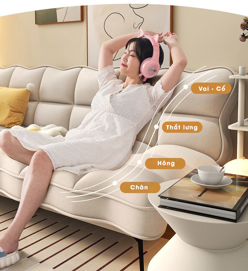 Sản phẩm được thiết kế theo nguyên lý ergonomic (công thái học), giúp ôm sát và hỗ trợ tối đa cho vai cổ, thắt lưng, hông và chân. Nhờ vậy, bạn có thể ngồi đọc sách, trò chuyện, xem phim hay thậm chí ngủ trưa hàng giờ liền mà vẫn cảm thấy dễ chịu và thư thái.