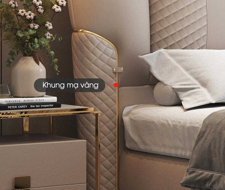 Tựa đầu cao kết hợp các chi tiết chần tỉ mỉ và đường nét trang trí tinh xảo tạo nên phong cách Ý đặc trưng. Giường không chỉ là nơi nghỉ ngơi lý tưởng mà còn là điểm nhấn thời thượng, nâng tầm thẩm mỹ cho căn phòng ngủ.