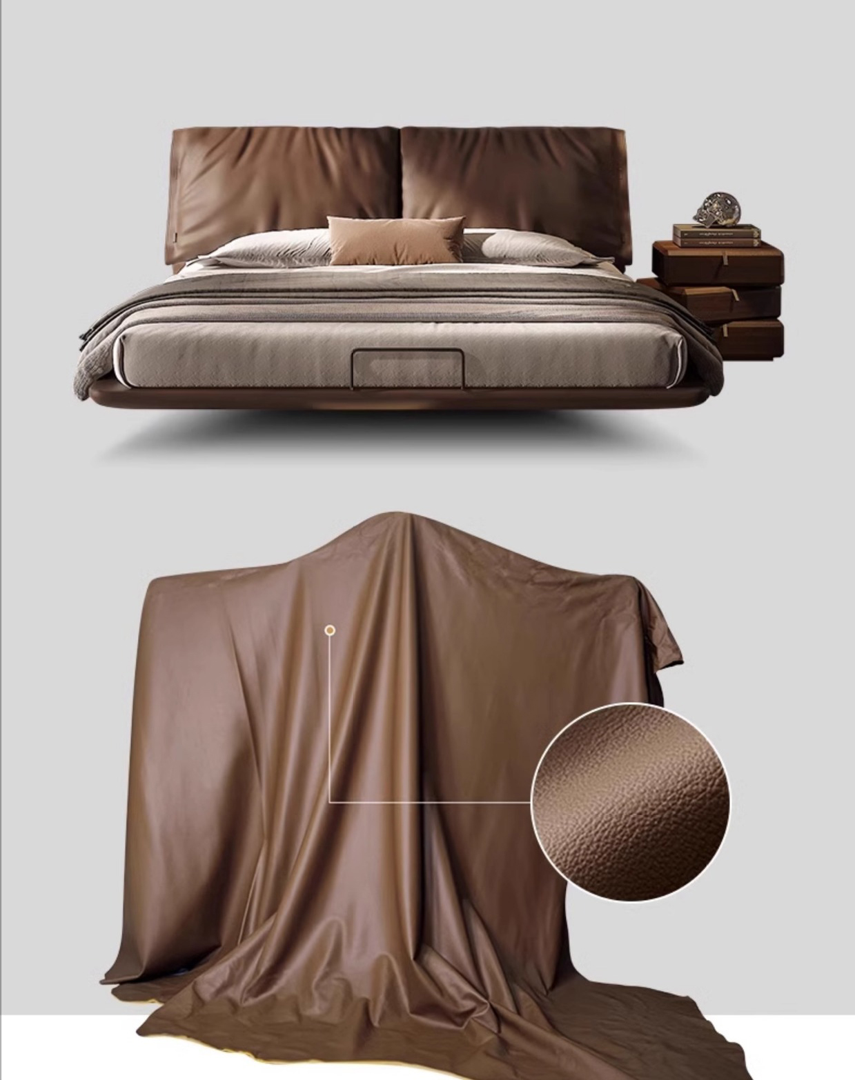 giường ngủ được bọc bằng da bò thật, mềm mại và mịn màng. Da tự nhiên không chỉ mang đến cảm giác chạm dễ chịu mà còn có độ bền ấn tượng, càng sử dụng càng lên màu đẹp, khẳng định phong cách sống đẳng cấp.
