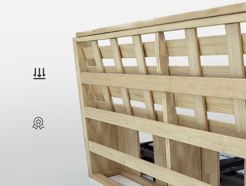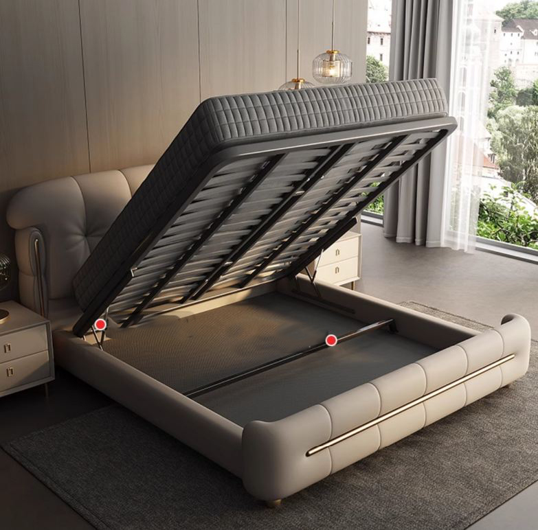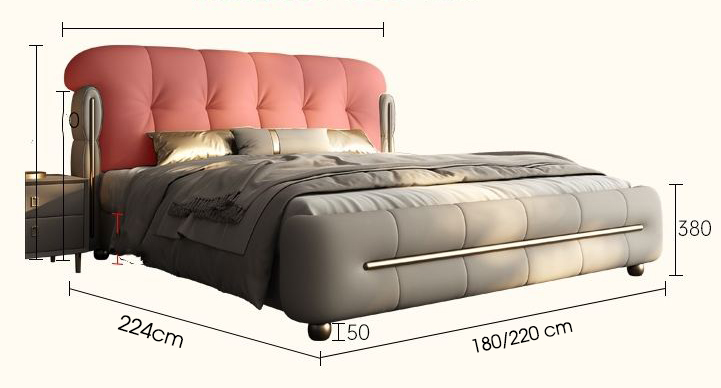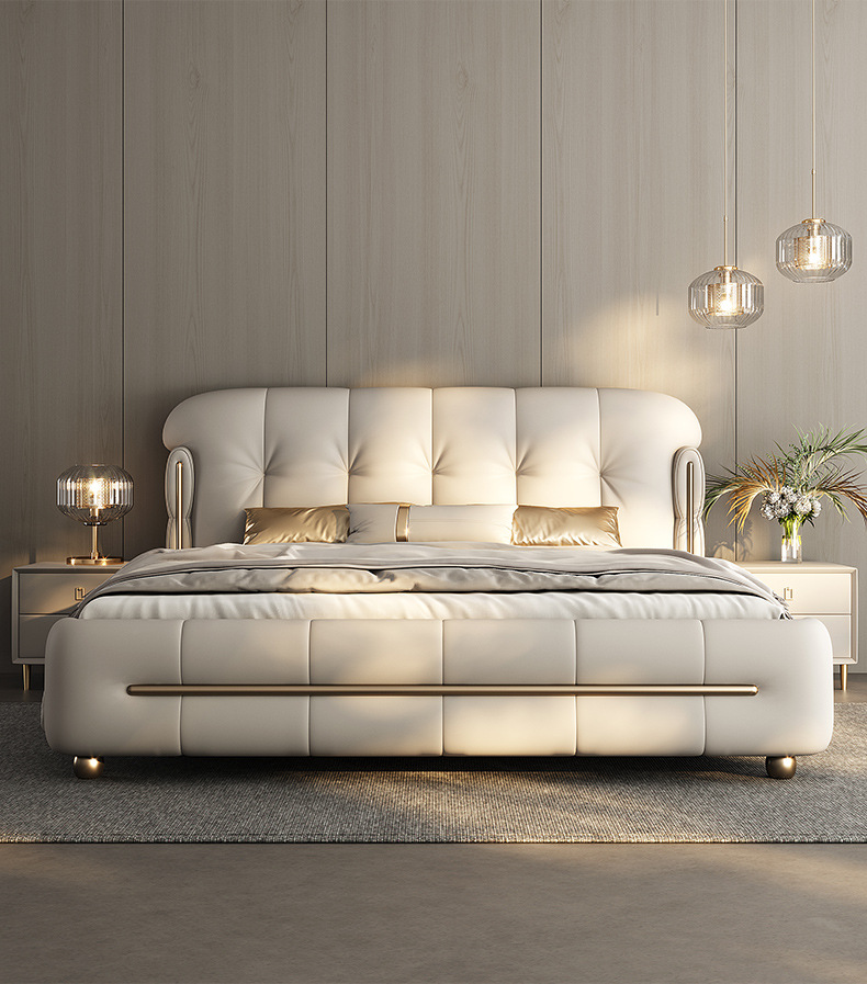 Khung giường được làm từ gỗ nguyên khối bền vững, mang lại khả năng chịu lực vượt trội. Sự vững chãi trong cấu trúc kết hợp cùng sự mềm mại của lớp da bọc, tạo nên một chiếc giường vừa tiện nghi vừa sang trọng.