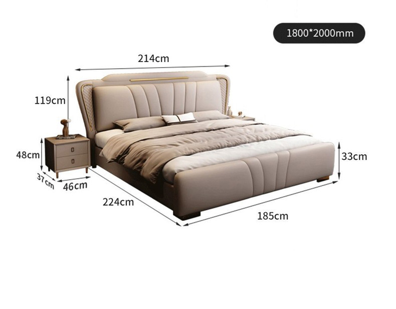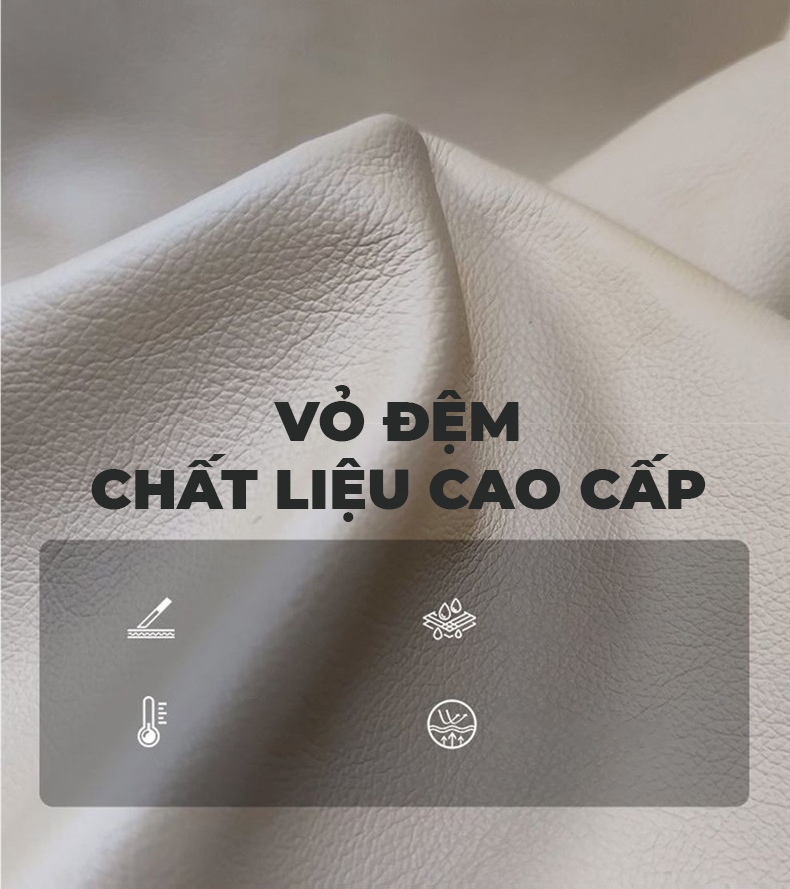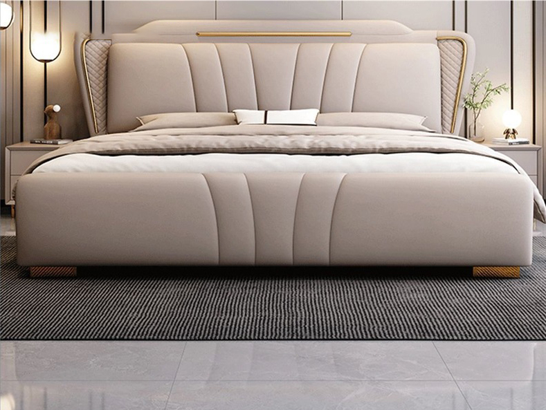 Toàn bộ bề mặt giường sử dụng da bò thật, có độ đàn hồi tốt và khả năng chống nứt gãy. Chất liệu cao cấp này mang đến cảm giác mềm mại khi tiếp xúc và giữ nguyên nét sang trọng sau nhiều năm sử dụng.