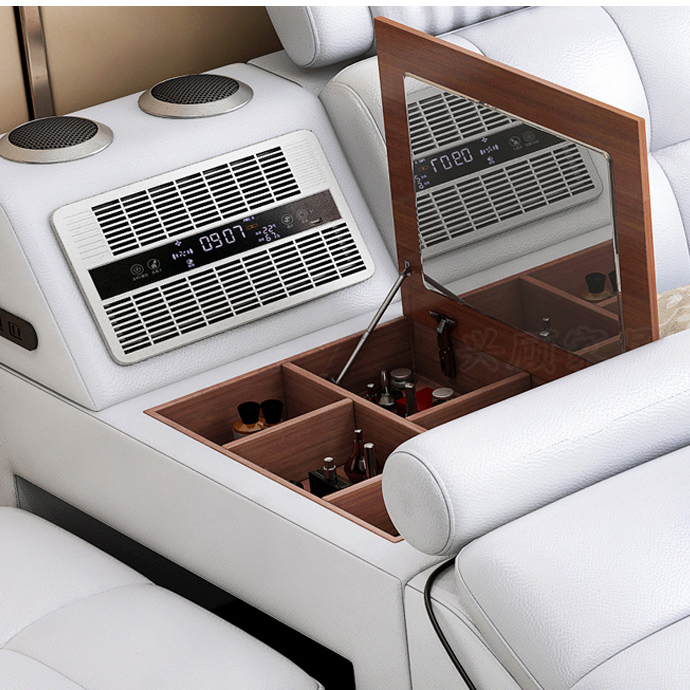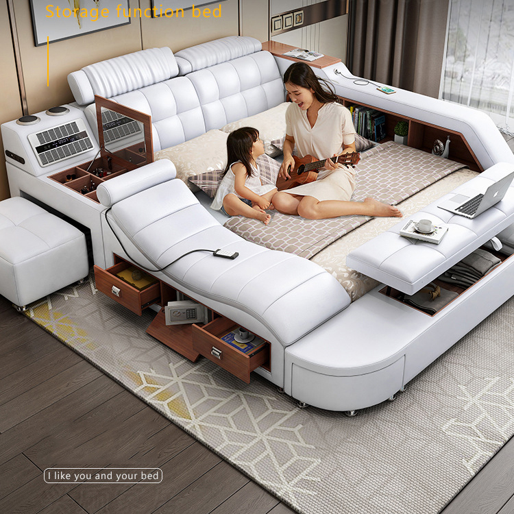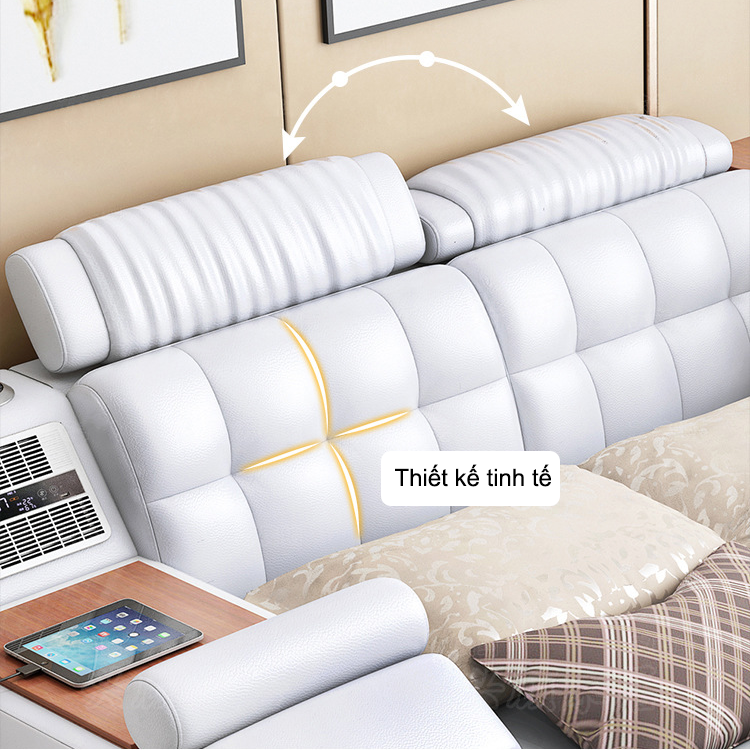 GIƯỜNG NGỦ MASSAGE trang bị nhiều tiện ích: đầu giường điều chỉnh linh hoạt, loa bluetooth, ghế massage, két sắt, bàn trang điểm kiêm bàn trà, quạt gió, tủ lưu trữ, cổng sạc usb, ghế đẩu di động,...