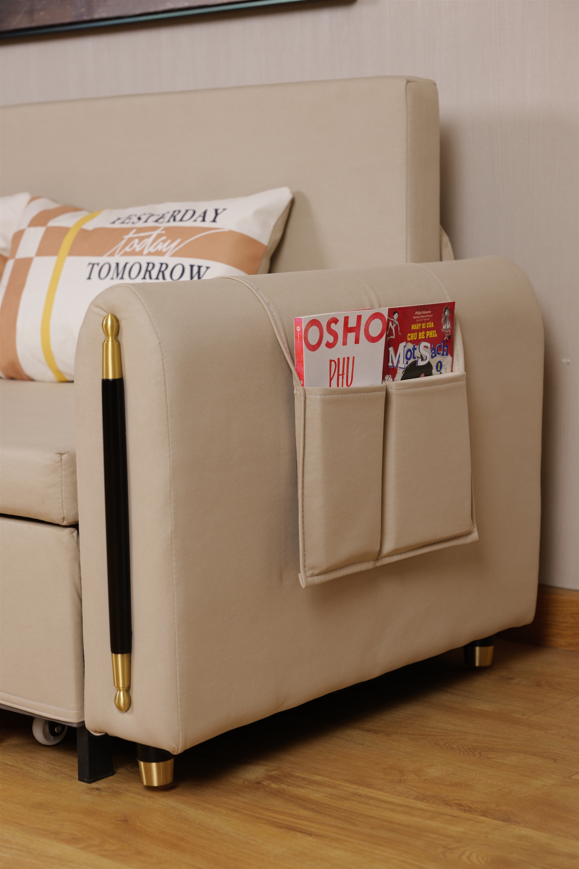 Bên cạnh tay vịn của Giường Sofa Đa Năng Cao Cấp ERICA – ED7 có trang bị thêm những ngăn túi zip để sách báo, tạp chí, máy tính bảng, điều khiển TV,.... Thiết kế này tạo thêm tiện ích cho người sử dụng, tất cả những gì bạn cần đều ở trong tầm với.
