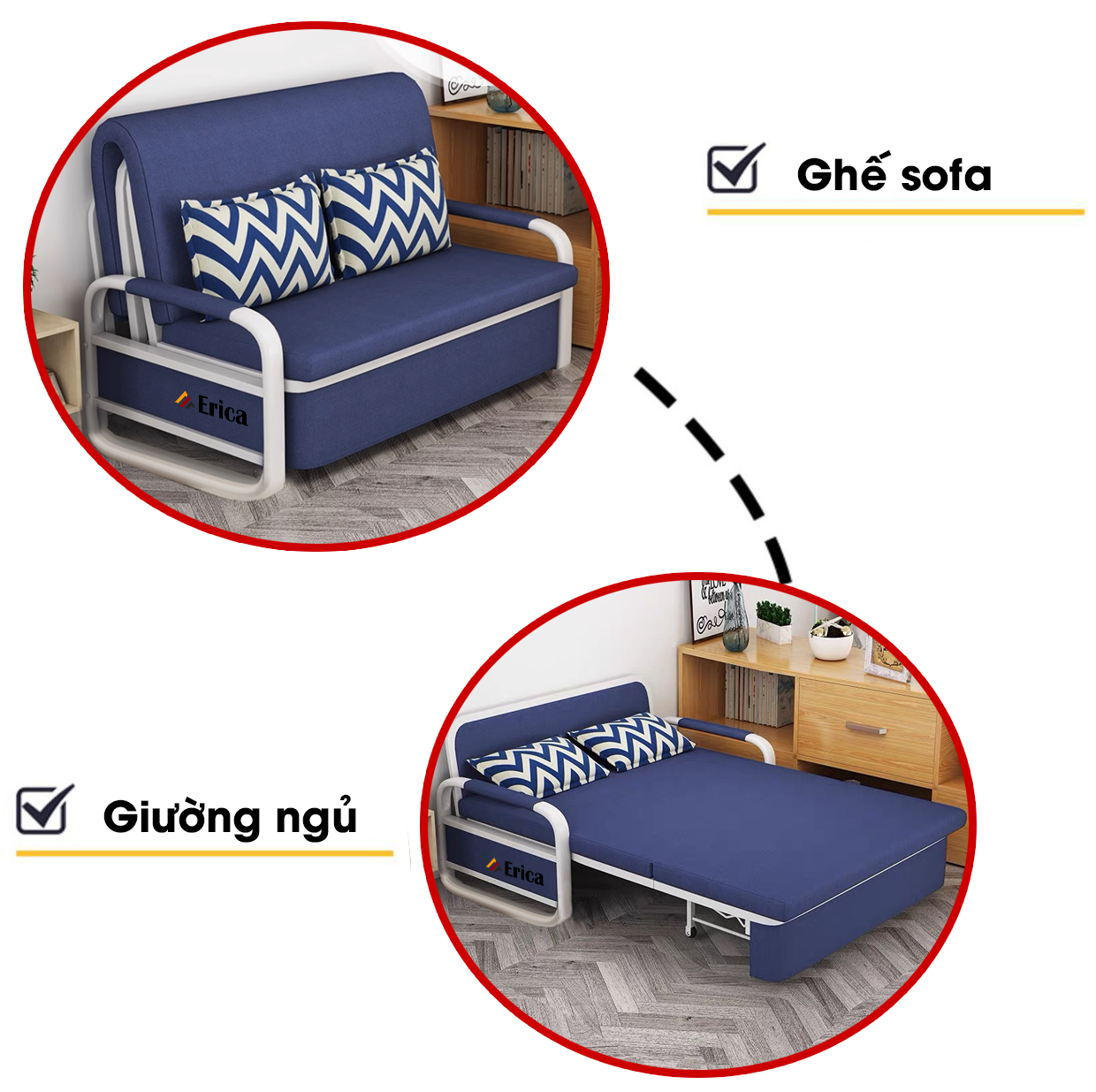 Điểm thu hút của ERICA - E2 chính là thiết kế thông minh, công năng ấn tượng. Mở rộng là giường ngủ, gấp gọn là sofa phòng khách. Thao tác đơn giản, gọn nhẹ, không tốn sức; tiết kiệm thời gian, công sức và cả không gian ngôi nhà, nhường nhiều khoảng trống cho các sinh hoạt chung.