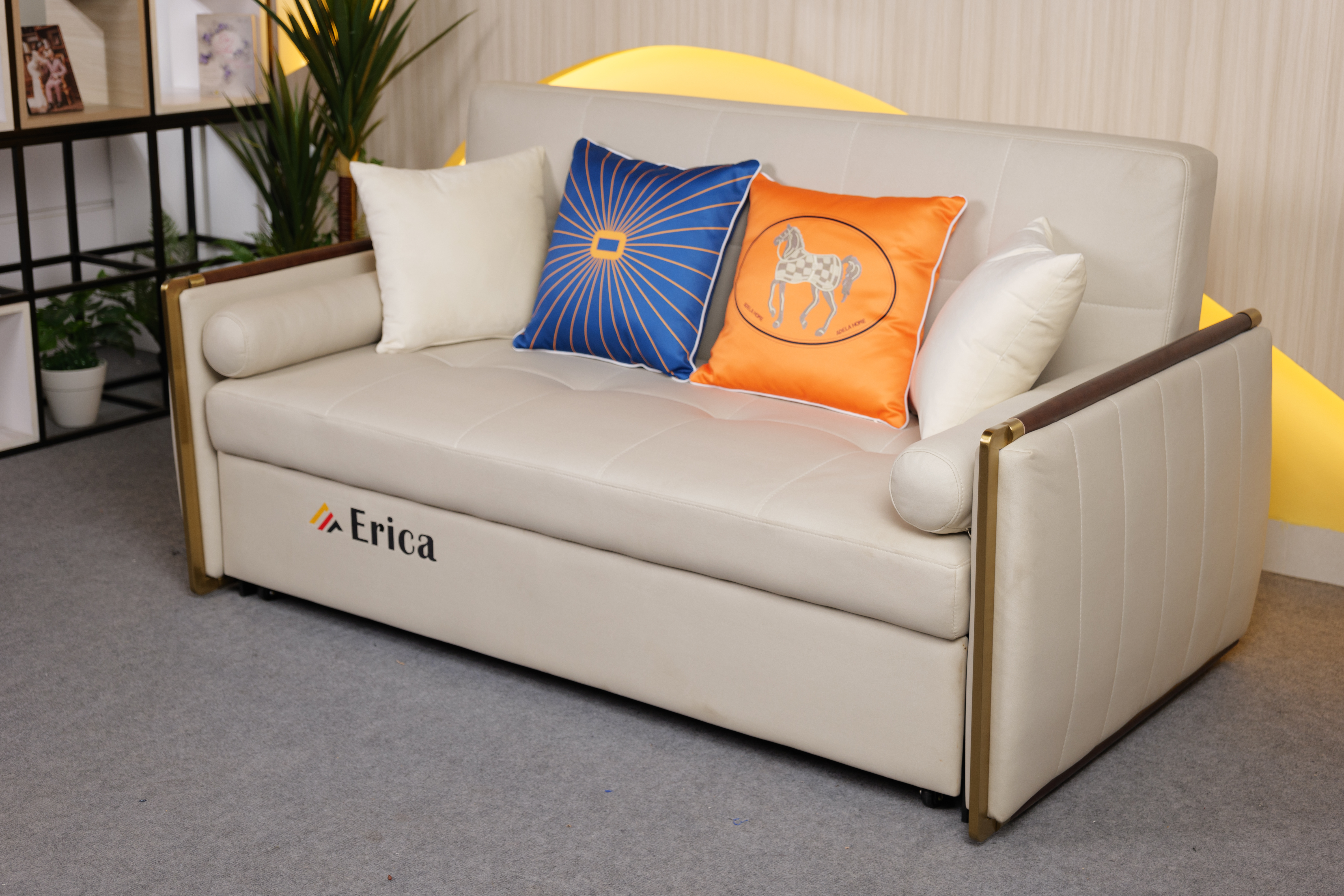 ERICA – LX9 nổi bật bởi thiết kế thanh lịch đậm chất Ý kết hợp với tone màu trắng kiêu sa cùng chất vải có kết cấu tựa như chất nỉ giả da, sẽ như một mảnh ghép nghệ thuật giúp nâng tầm không gian bày trí. ERICA – LX9  còn gây ấn tượng bởi chi tiết mạ vàng lấp lánh hiện diện ở phần tay vịn, được phun sơn titan màu vàng óng ánh, khi kết hợp với ánh đèn huyền ảo, sẽ đem lại một không gian sống cực thu hút. Siêu phẩm nội thất này sở hữu tận 3 chức năng, đó là: sofa văng, sofa băng dài, giường ngủ, đáp ứng tốt mọi nhu cầu.