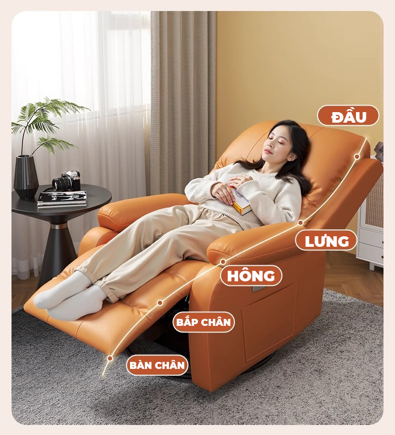 Bạn dễ dàng chuyển đổi ghế sofa thành giường mini chỉ bằng một thao tác nhấn nút chỉnh điện ở ngay bên hông. Lúc này, tựa lưng ngả nhẹ về sau, chân ghế nâng lên đồng bộ giúp cơ thể được thả lỏng tối đa – lý tưởng cho những giấc ngủ ngắn hay lúc nghỉ trưa. Thiết kế công thái học giúp phân bổ trọng lực đều, giảm áp lực lên vai, gáy, lưng và chân.