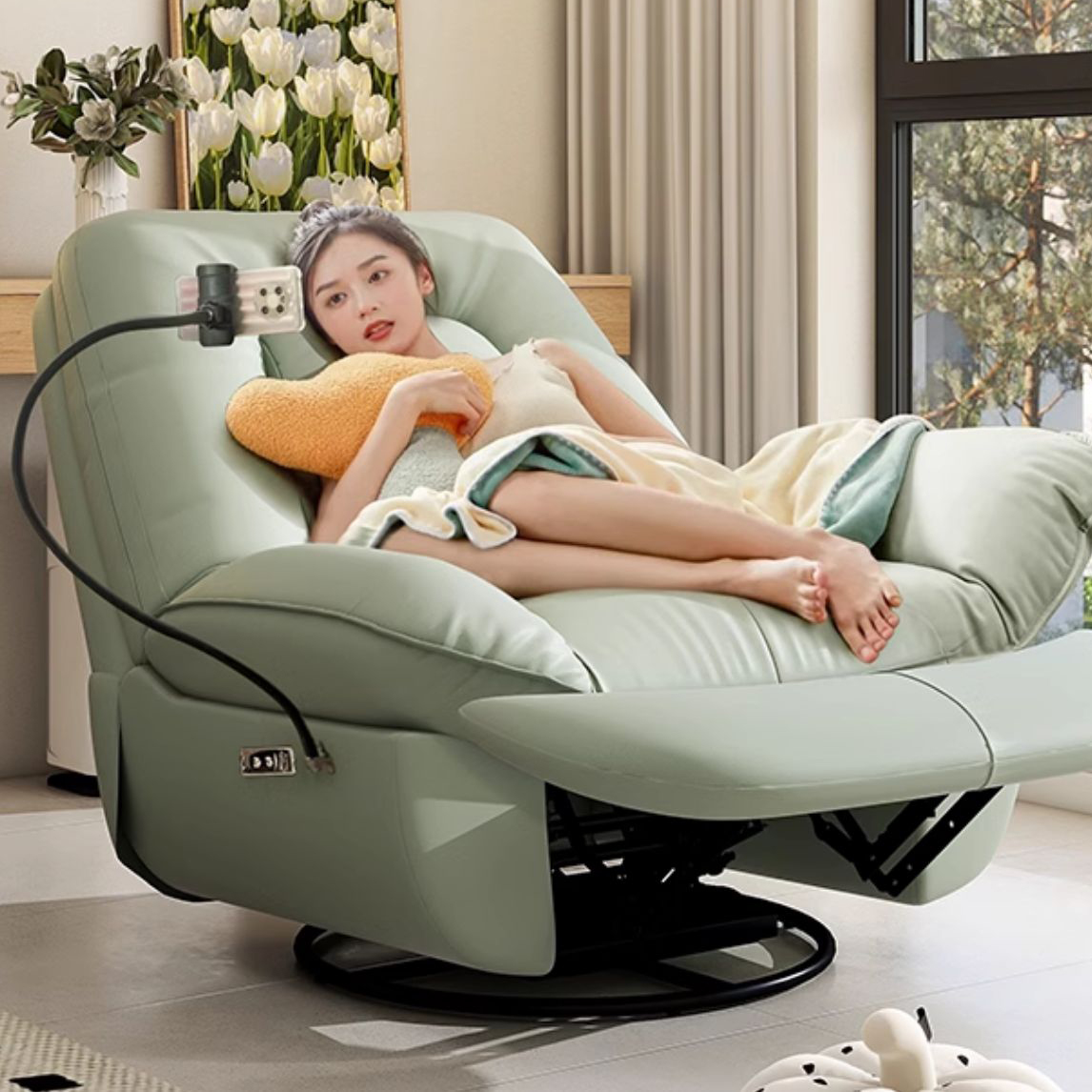Sự tiện nghi được nâng tầm nhờ thiết kế giá đỡ điện thoại ngay trên sofa. Bạn có thể vừa xem phim, gọi video, vừa lướt tin tức hay đọc sách một cách thoải mái mà không phải giữ thiết bị trên tay – mang đến trải nghiệm thư giãn đúng nghĩa.