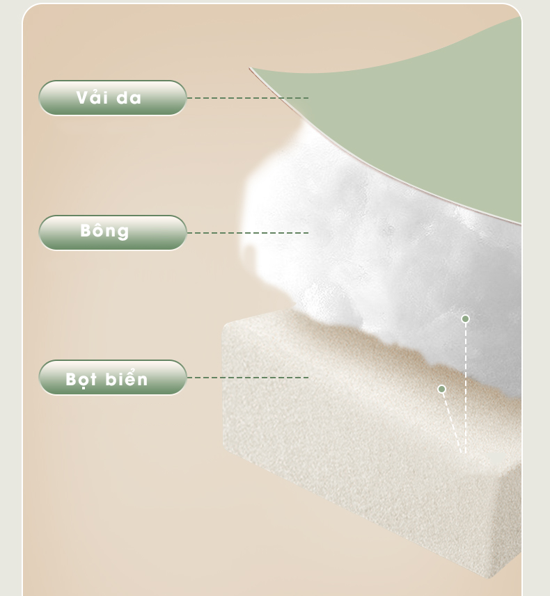Phần đệm được tạo thành từ hai lớp chất liệu cao cấp: bông búp bê mềm mại và mút đàn hồi cao cấp, tạo nên cảm giác êm ái vượt trội khi ngồi hoặc nằm. Thiết kế ôm trọn cơ thể giúp giảm áp lực tại các điểm tiếp xúc, mang đến trải nghiệm dễ chịu như đang được nâng đỡ bởi một lớp mây nhẹ.