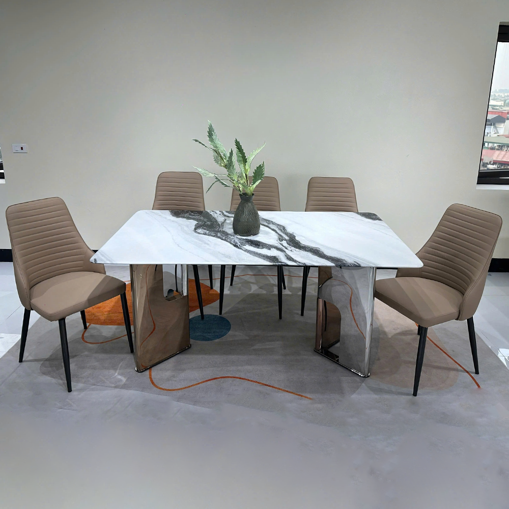 Bộ bàn ăn 6 ghế này có ngoài hình cực chất theo phong cách Châu Âu. Mặt bàn bằng đá, họa tiết vân tự nhiên tinh tế, mang lại cảm giác thanh thoát, sang trọng. Màu sắc này tạo sự hài hòa cho không gian bày trí, khiến không gian trở nên rộng rãi và thoáng đãng hơn. Chân bàn bằng inox mạ crom sáng bóng, được thiết kế tinh tế với hai trụ có tạo hình độc đáo, vừa tạo điểm nhấn thẩm mỹ cho sản phẩm, vừa trở thành điểm tựa vững chắc giúp nâng đỡ mặt bàn.