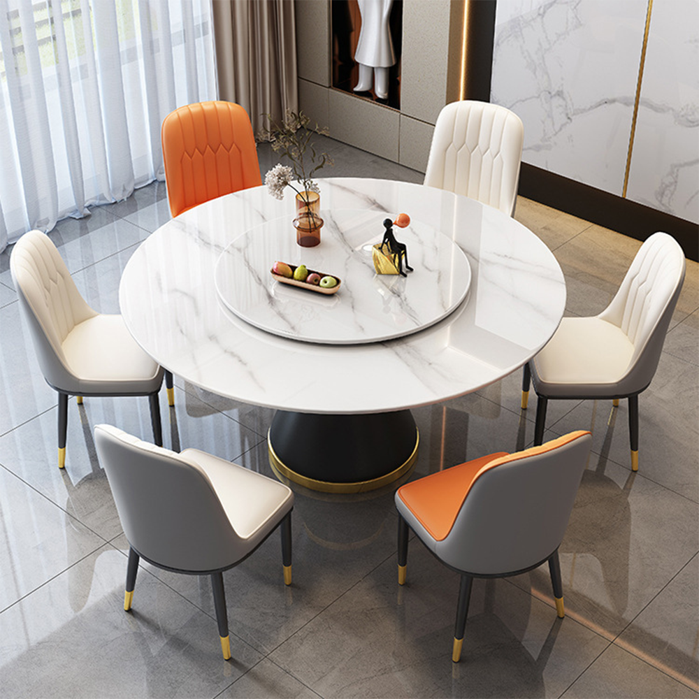 Bộ bàn ăn 6 ghế  này sẽ mang đến một vẻ đẹp hợp thời theo phong cách Ý hiện đại. Thiết kế dạng bàn tròn mang lại cảm giác quây quần và sum vầy. Mặt bàn bằng đá có nhiều ưu điểm: chống ăn mòn, chịu nhiệt, chống thấm, chống bám bẩn. Chân bàn hình trụ độc đáo bằng kim loại sơn tĩnh điện không gỉ, bền bỉ – chắc chắn cực kỳ. Mặt bàn có trang bị mâm xoay 2 chiều 360°, khiến việc di chuyển các món ăn trở nên dễ dàng.